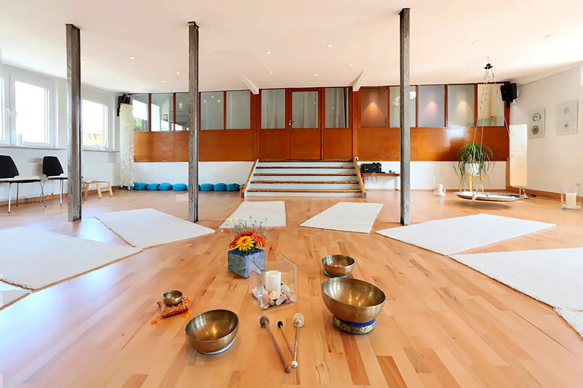 - Die Räume können stundenweise gemietet werden, z. B. für laufende Kurse wie Yoga, Pilates, Körperarbeit usw.
